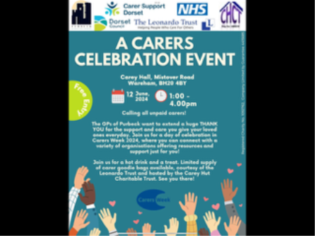 The GPs of Purbeck want to extend a huge THANK YOU for the support and care you give your loved ones everyday. Join us for a day of celebration in Carers Week 2024, where you can connect with a variety of organisations offering resources and support just for you!